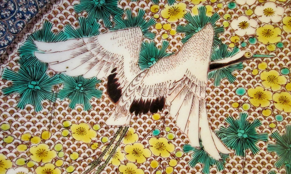 九谷の伝統を守りながら、鴛鴦*や鶴、松竹梅などの吉祥文をメインに描き、背景を唐草や青海波などの小紋でびっしりと描き埋めるという唯一無二な作風に昇華していきました。